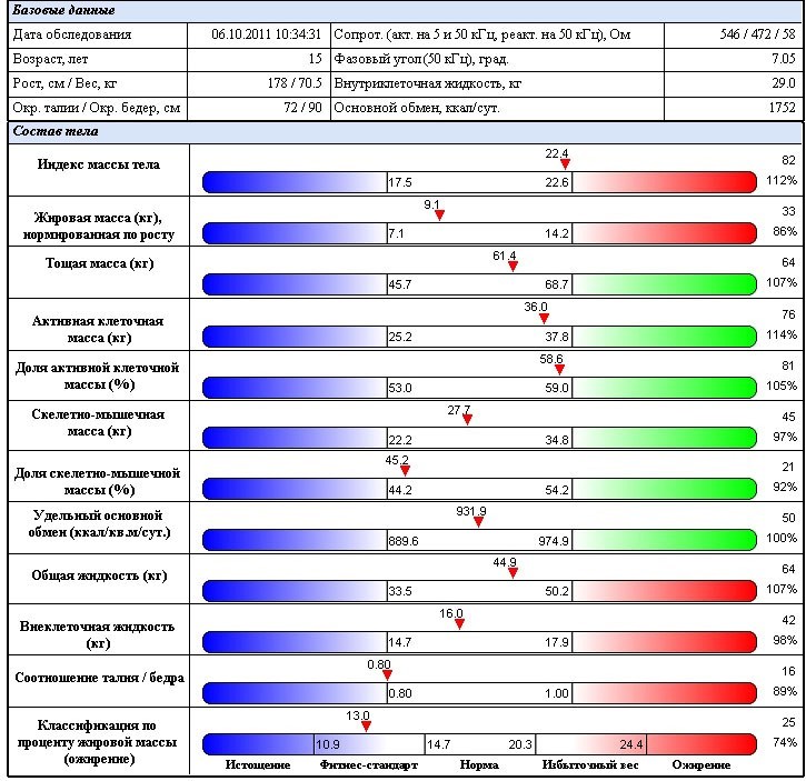 Оценивает показатели жировой и мышечной массы, основного обмена, метаболических процессов,