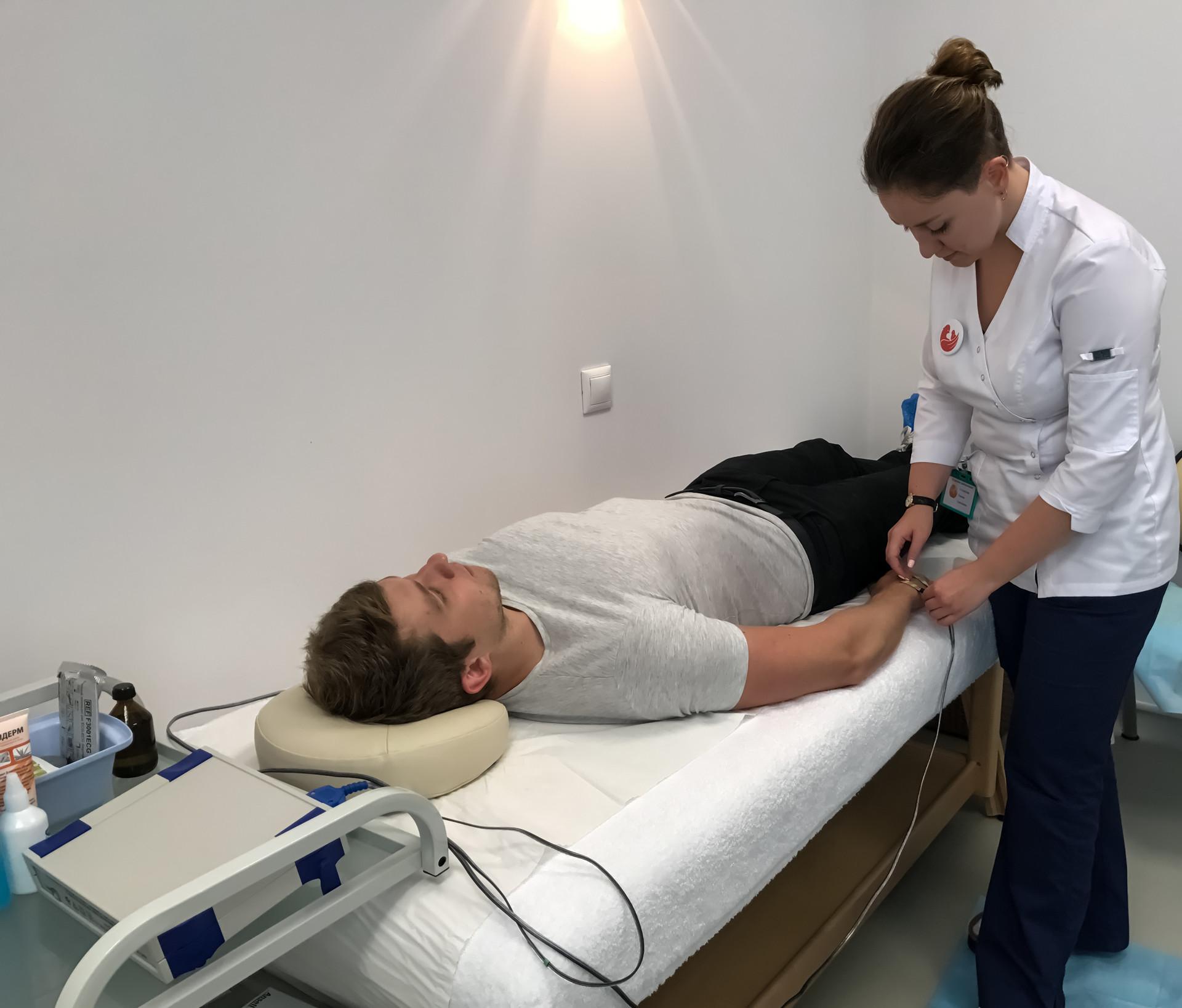Задаем возраст, пол, рост, вес, величины окружности талии и бедер пациента. Электроды крепим на кисти и стопе доминантной стороны тела.